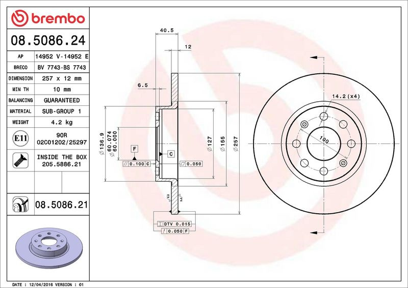 Brzdový kotouč BREMBO 08.5086.24 - FIAT