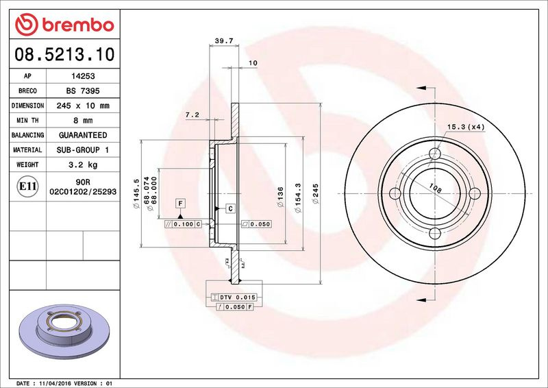 Brzdový kotouč BREMBO 08.5213.10 - AUDI