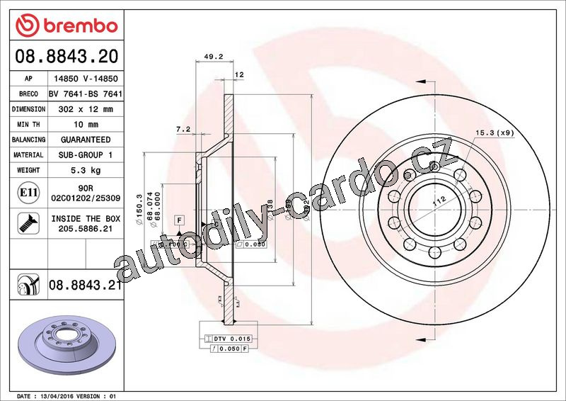 Brzdový kotouč BREMBO 08.8843.20 - AUDI