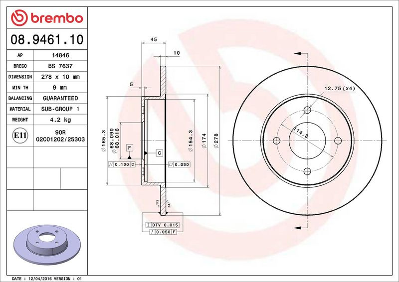 Brzdový kotouč BREMBO 08.9461.10 - NISSAN
