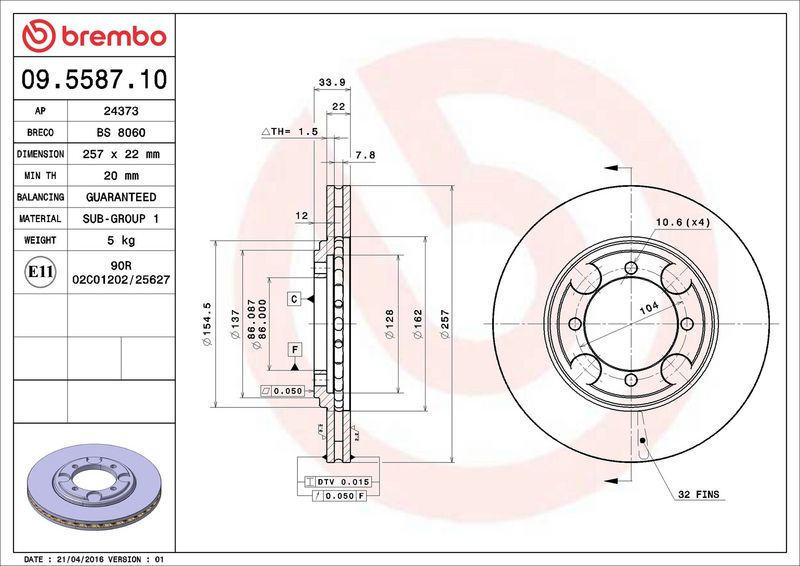 Brzdový kotouč BREMBO 09.5587.10 - HYUNDAI