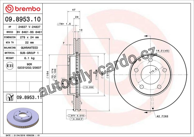 Brzdový kotouč BREMBO 09.8953.10 - FORD, MAZDA