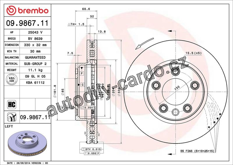 Brzdový kotouč BREMBO 09.9867.11 - PORSCHE, VW