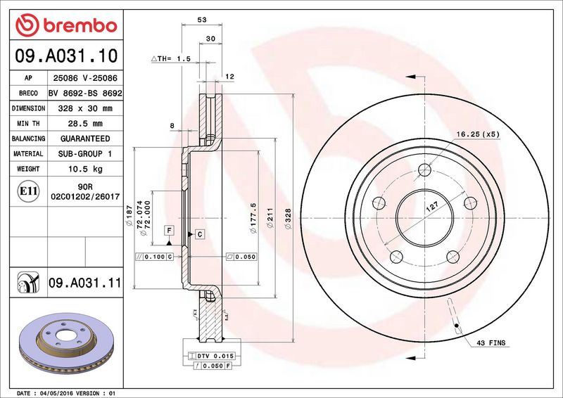 Brzdový kotouč BREMBO 09.A031.10 - JEEP