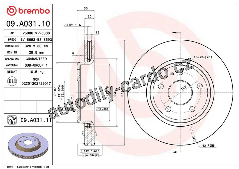 Brzdový kotouč BREMBO 09.A031.10 - JEEP