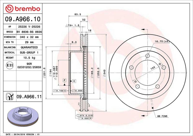 Brzdový kotouč BREMBO 09.A966.11 - TOYOTA
