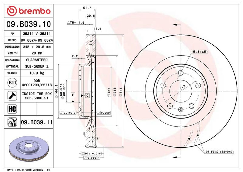 Brzdový kotouč BREMBO 09.B039.11 - AUDI