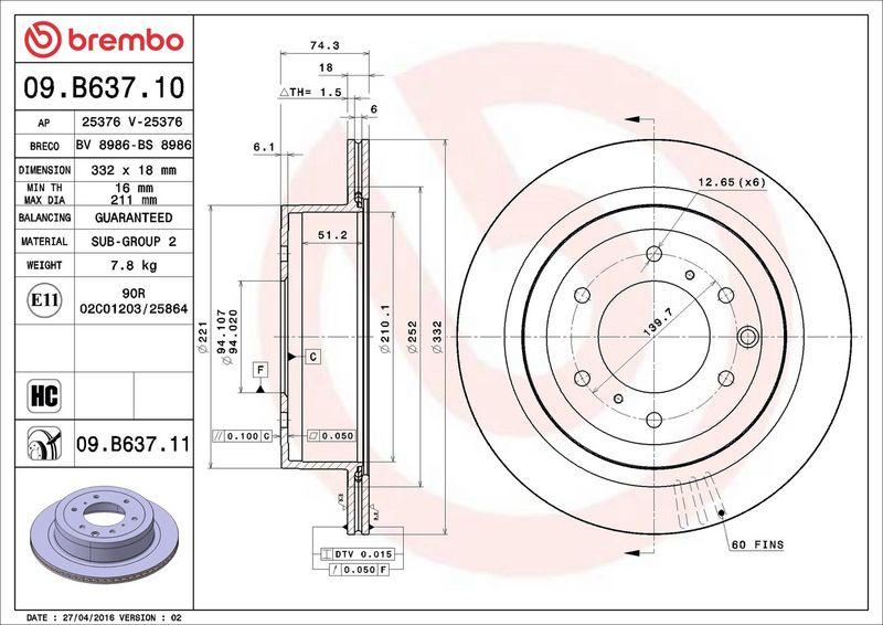 Brzdový kotouč BREMBO 09.B637.11 - MITSUBISHI