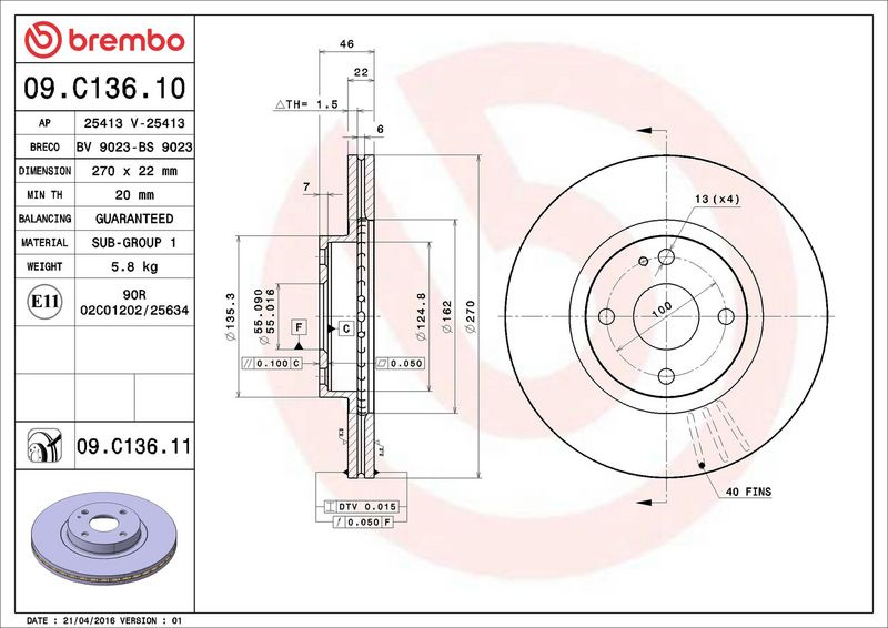 Brzdový kotouč BREMBO 09.C136.10 - MAZDA