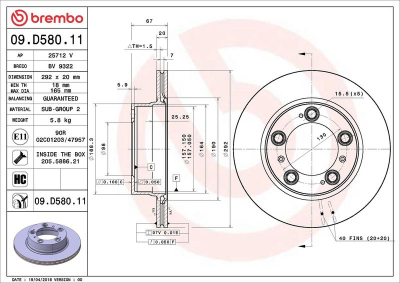 Brzdový kotouč BREMBO 09.D580.11 - PORSCHE