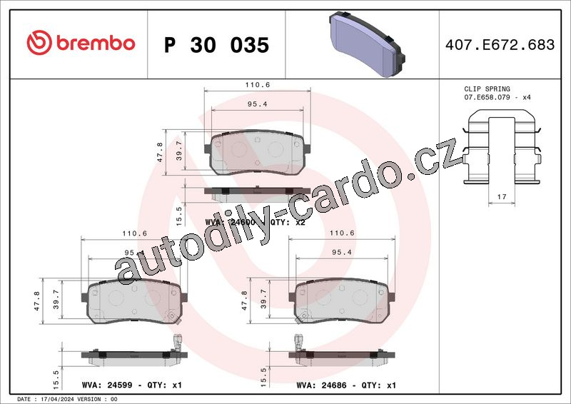 Sada brzdových destiček BREMBO P30035 - HYUNDAI, KIA