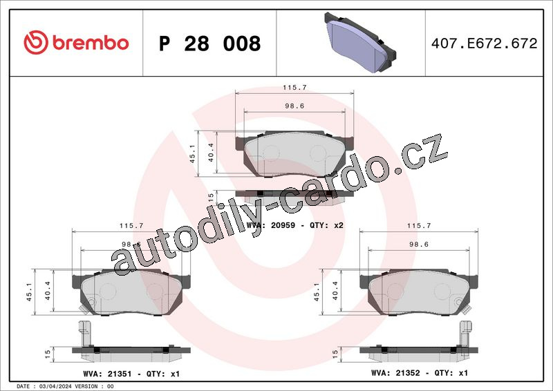 Sada brzdových destiček BREMBO P28008 - HONDA