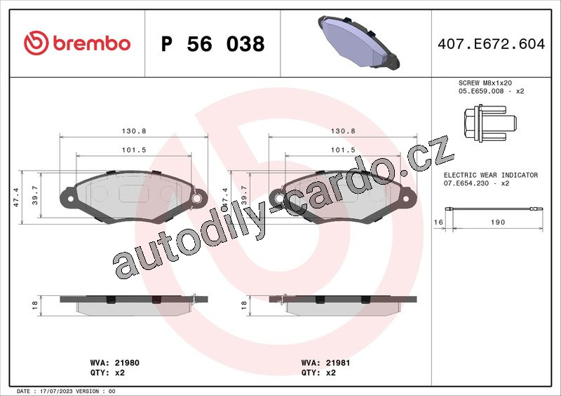 Sada brzdových destiček BREMBO P56038 - NISSAN, RENAULT