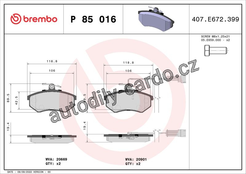 Sada brzdových destiček BREMBO P85016 - AUDI